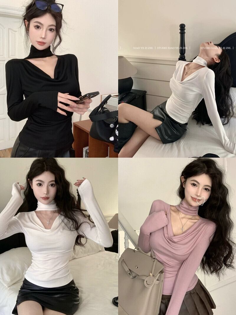 ピンクと紫のスイングカラー長袖 Tシャツ女性春の新純粋な欲望スタイルセクシーな甘くてスパイシーなスリムボトムシャツとインナートップ ロング 大人ガーリー スウィート キュート カジュアル スプリング 春物 ピュア パープル berry76850576007 | beaute25