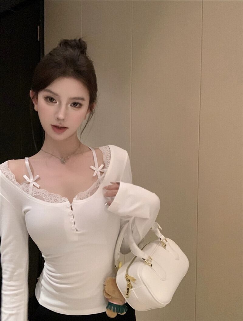 白いレースの長袖 Tシャツ女性春偽ツーピース U ネックセクシーな純粋な欲望スリムインナーボトリングシャツトップ ロング ホワイト スプリング 春物 ピュア berry11603055958 | beaute25