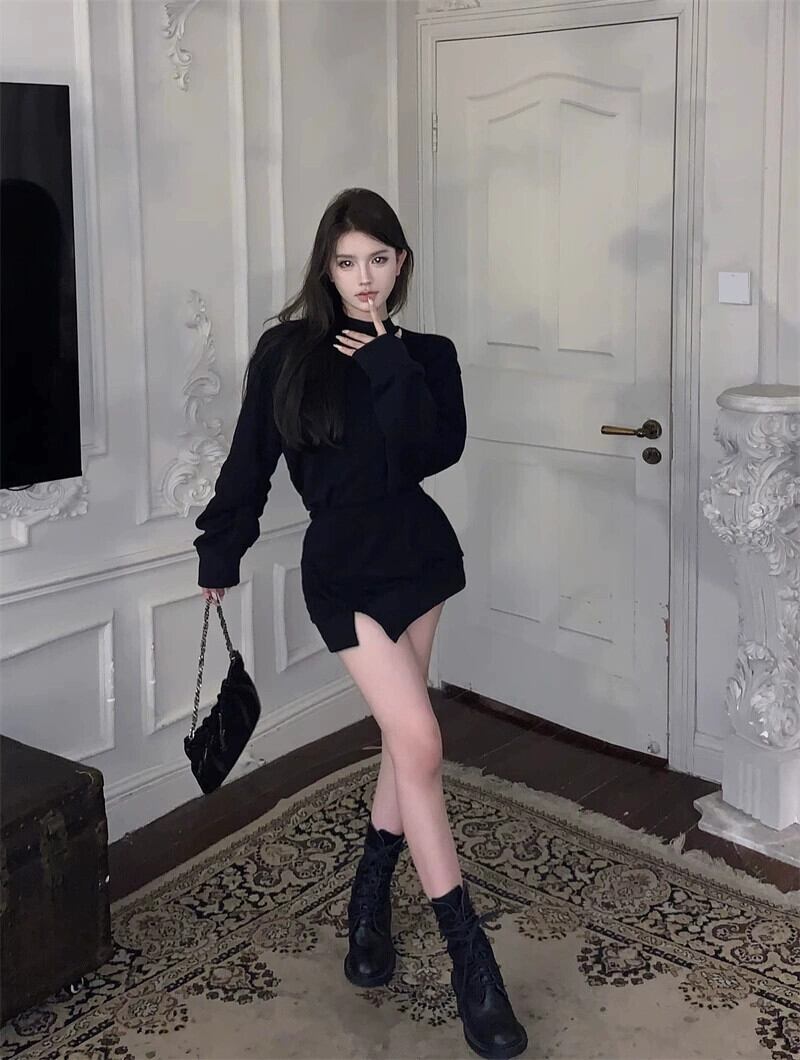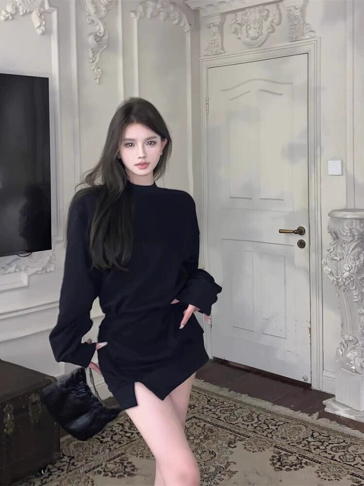 黒長袖ベルベットスウェットシャツドレス女性春ロイヤルシスタースタイルスカートデザインウエストカバーヒップショートスカート ロング ブラック スプリング 春物 berry9876104181 | beaute25