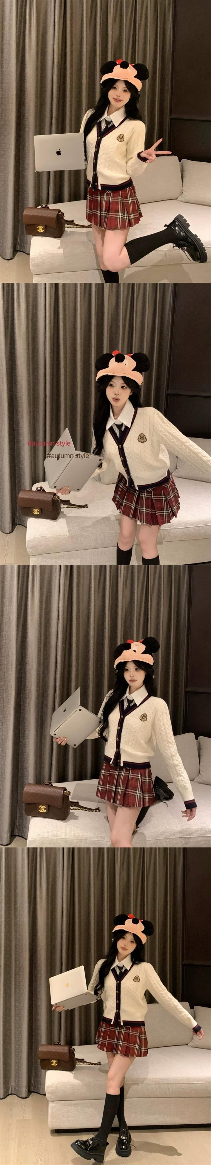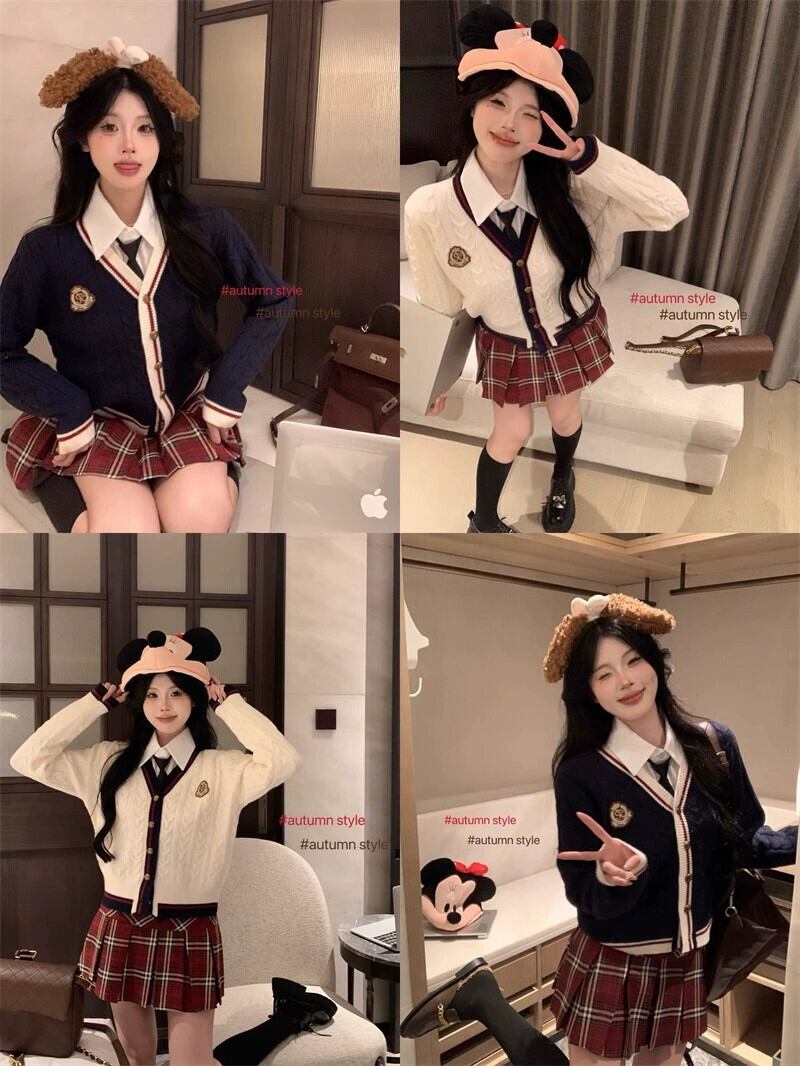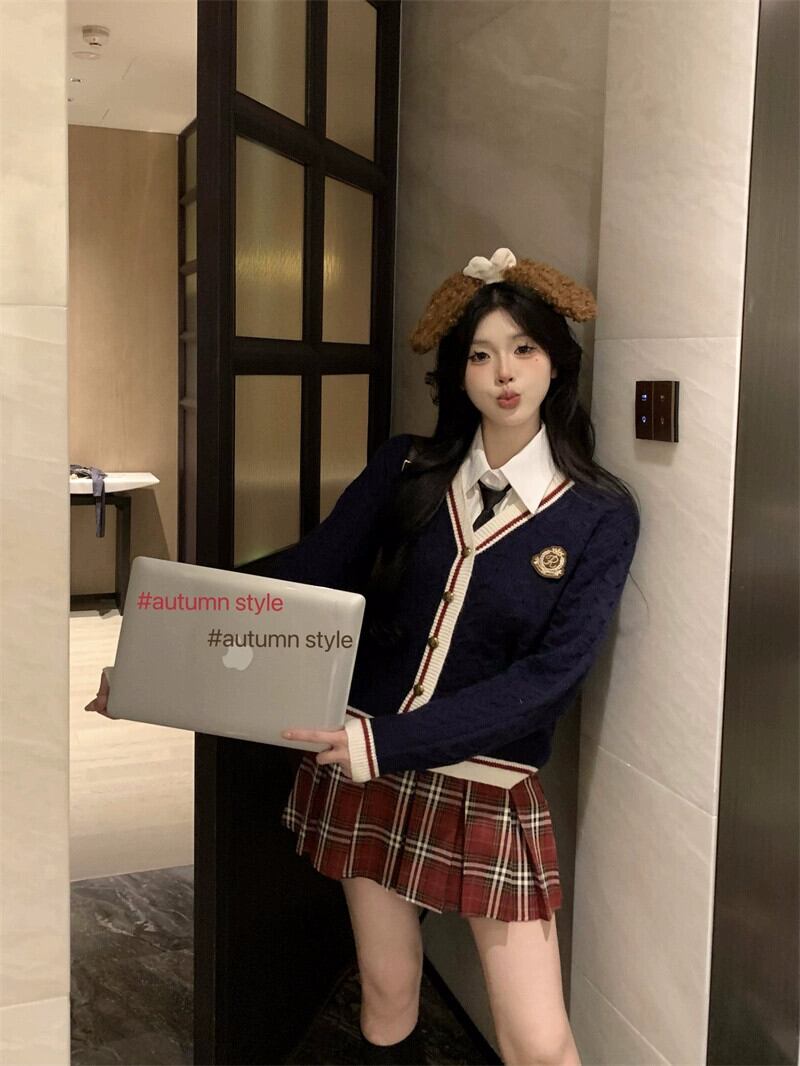 色:チェック柄スカート,ネクタイ付きシャツ,白いカーディガン,ブルーカーディガン