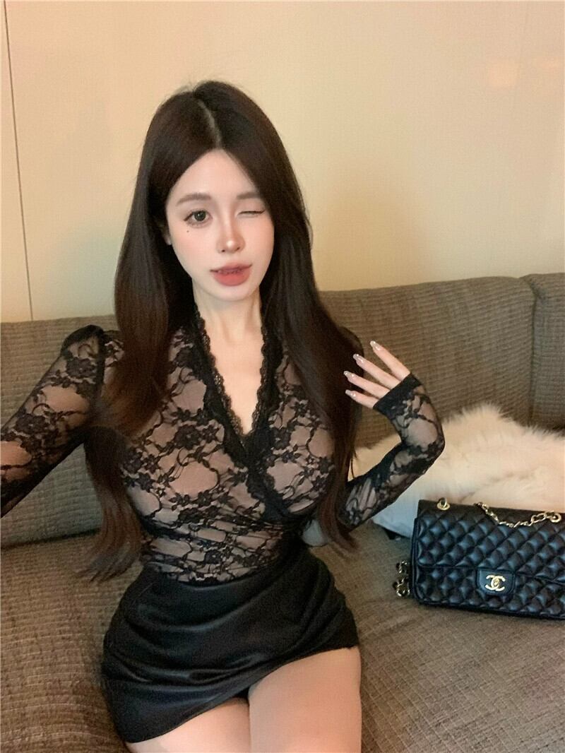 黒長袖 V ネックレースシャツ女性春先の新しいセクシーな純粋な欲望スリムインナーレイヤリングシャツトップ ロング ブラック スプリング 春物 Vネック ピュア berry87569101987 | beaute25