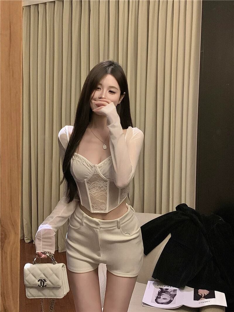 レースステッチ中空長袖スクエアネック Tシャツトップ女性春セクシーな純粋な欲望スリムショートインナーレイヤリングシャツ ロング スプリング 春物 ピュア スクウェア berry90372722537 | beaute25