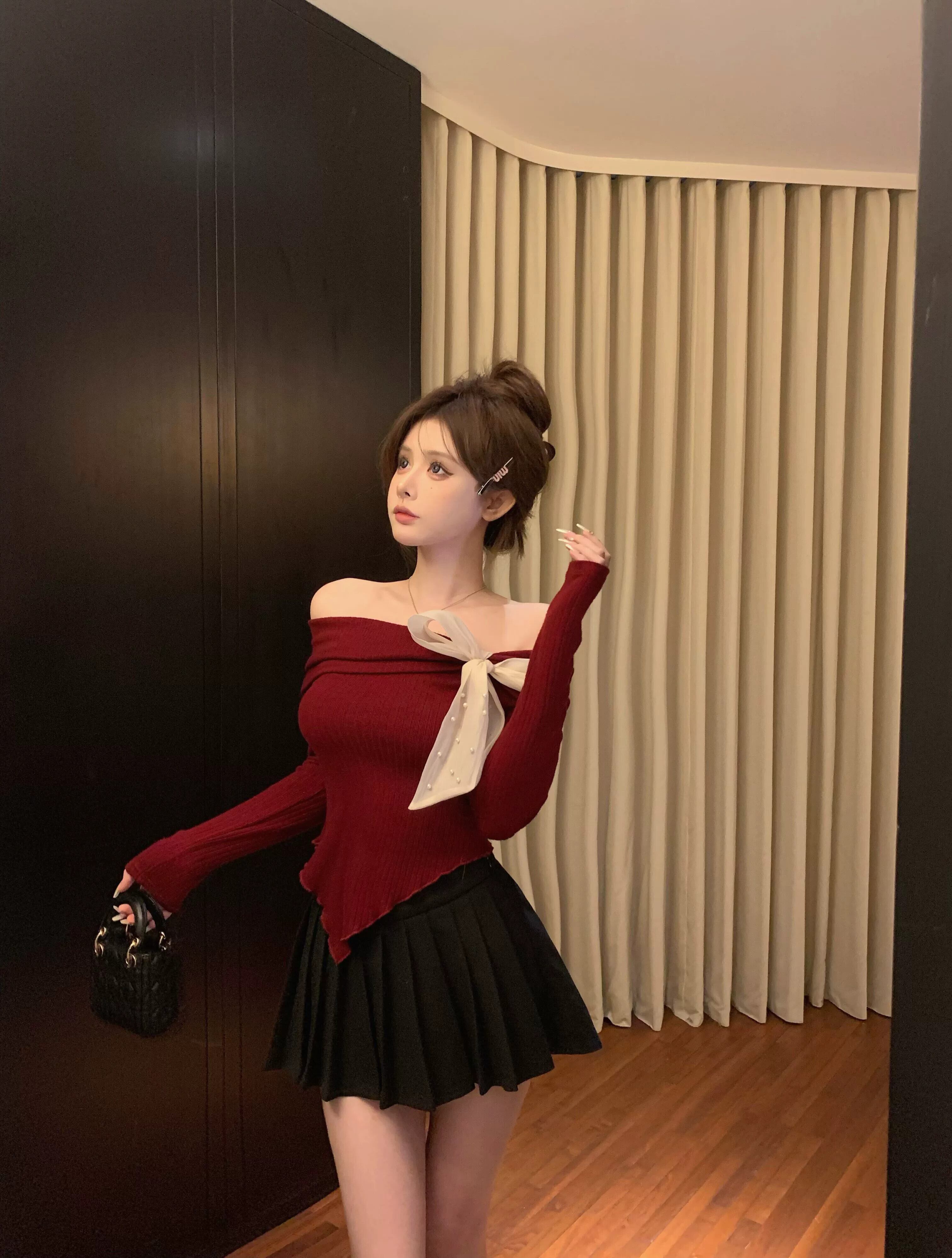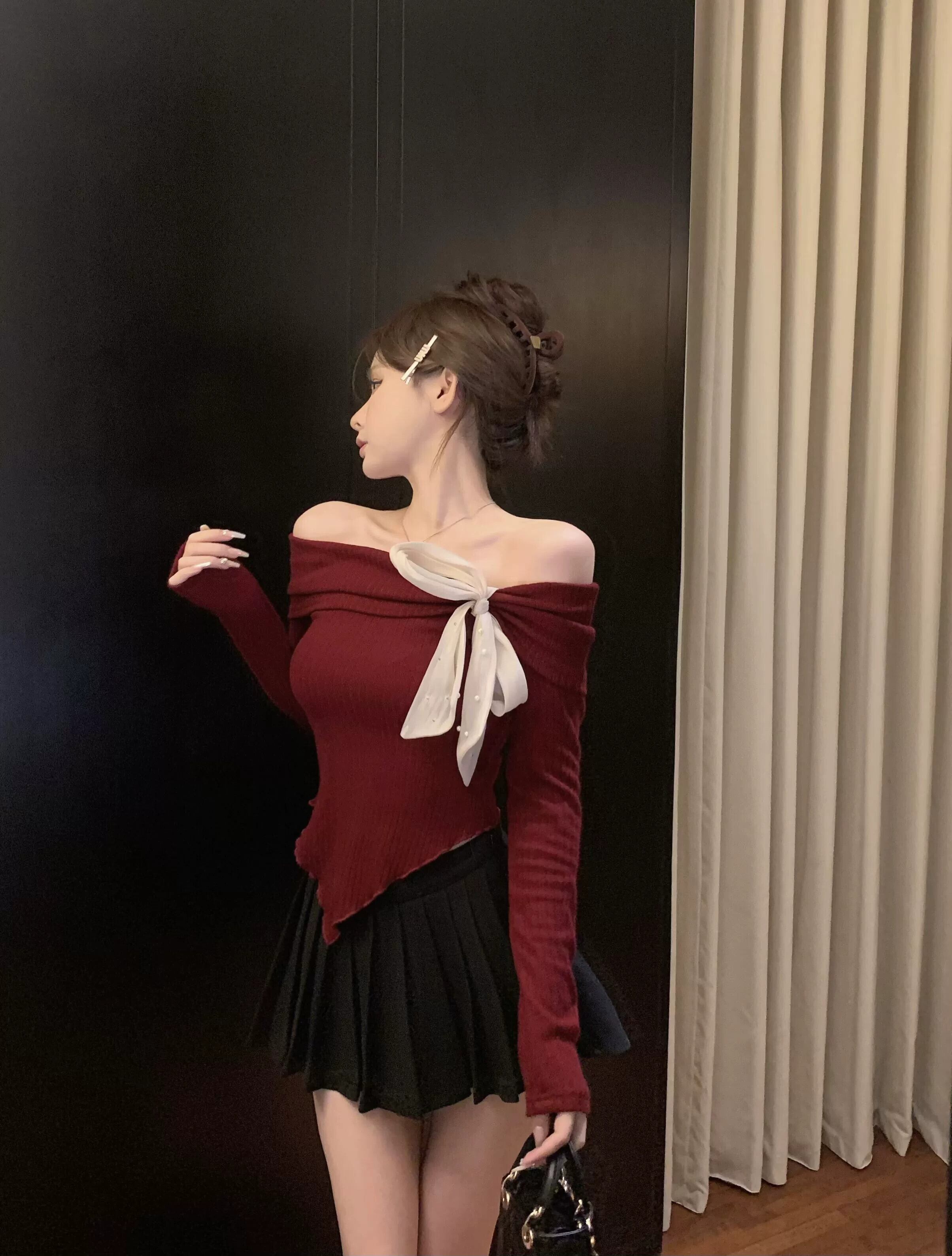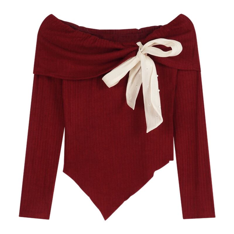赤いリボンワンラインカラーオフショルダー長袖セーター女性早春セクシーな甘い不規則なショートトップ ロング レッド 大人ガーリー スウィート キュート カジュアル スプリング 春物 berry75916433114 | beaute25