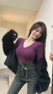 豪華な紫色の長袖 V ネック Tシャツボトシャツ女性春セクシーなスリムタイトなインナープルオーバートップ ロング スプリング 春物 Vネック パープル berry3942791884 | beaute25
