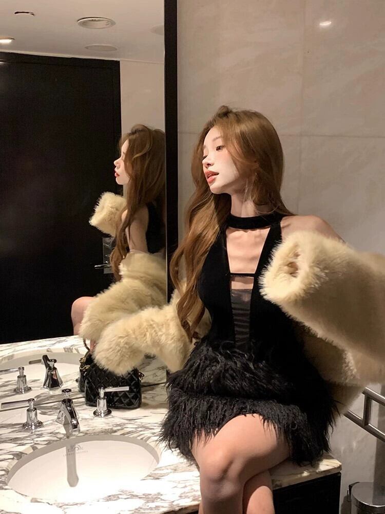 冬用の黒の背中の開いたホルターネックドレス、ウエストを締めるインナーAラインスカート、純粋な欲望のスプライシングメッシュプラッシュスカート ブラック ウィンター 冬物 ピュア berry72367247356 | beaute25