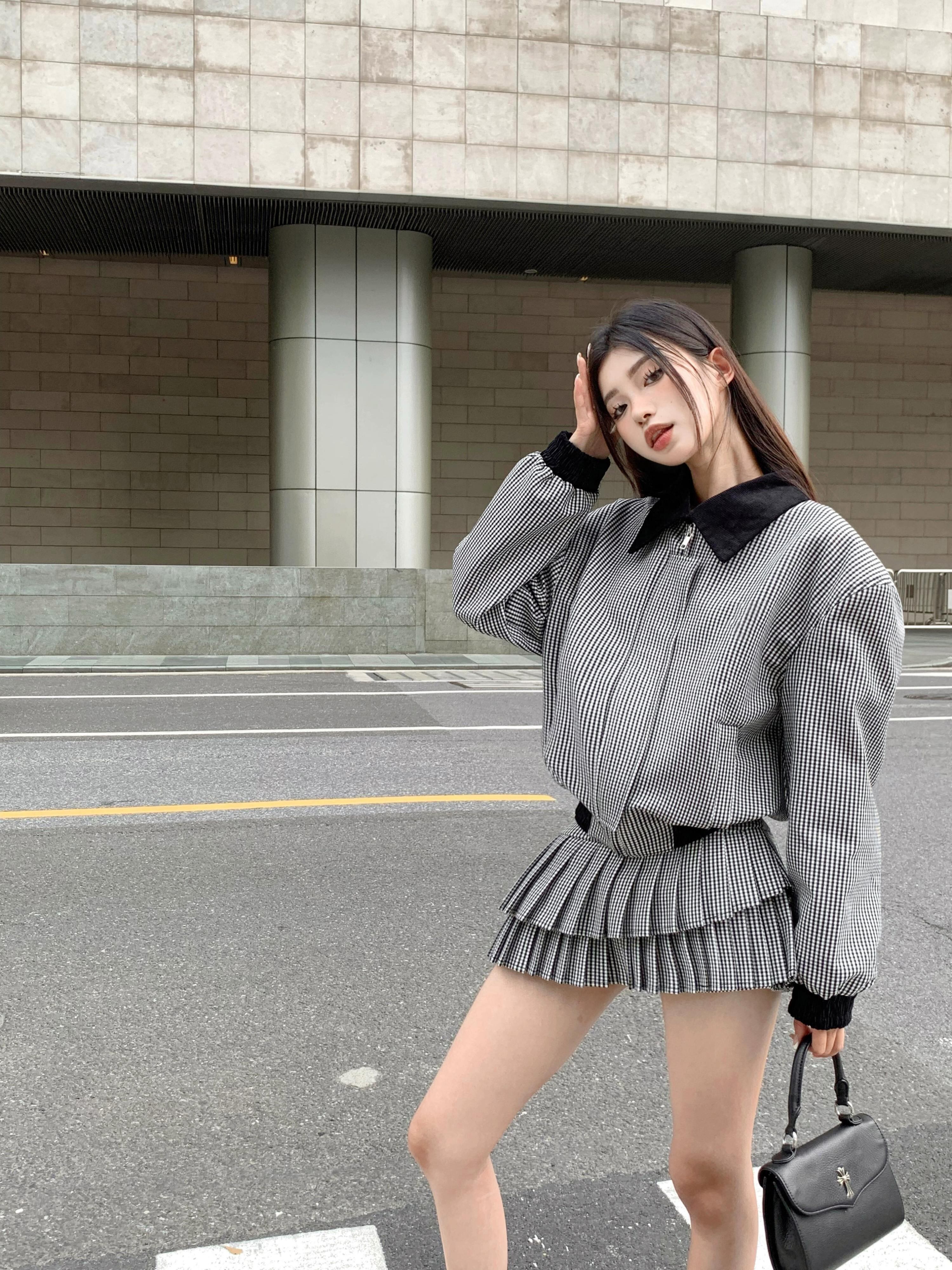 アメリカンレトロ黒と白のチェック柄ジャケットレディース秋と春先のスーツプリーツケーキスカート 2 点セット ホワイト ブラック スプリング 春物 オータム 秋物 berry53524419226 | beaute25