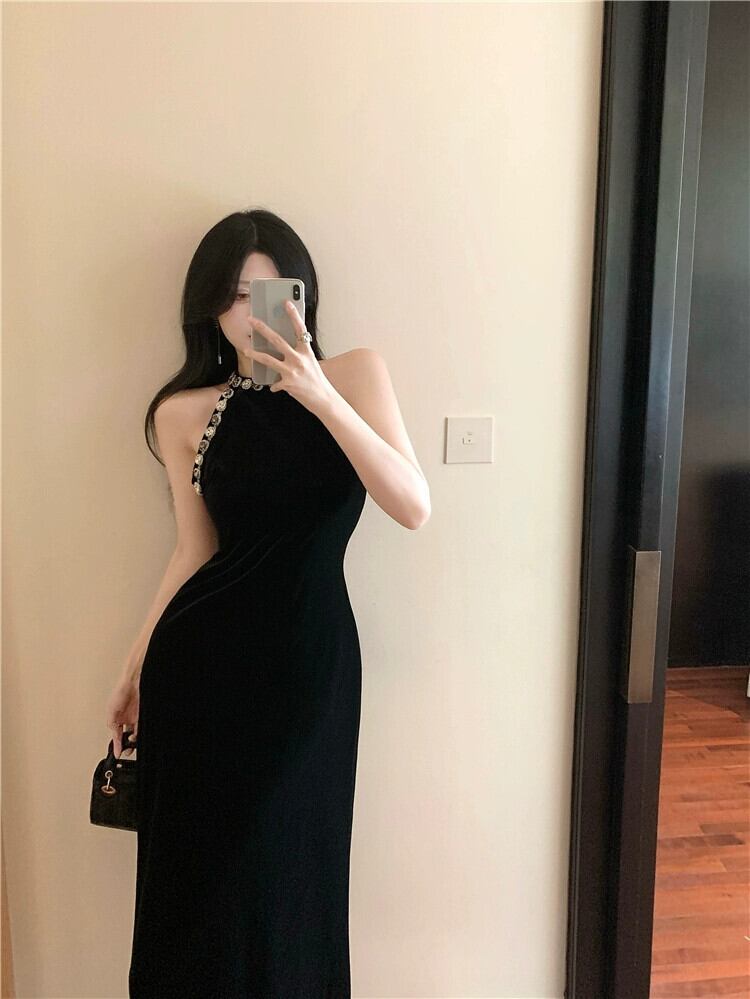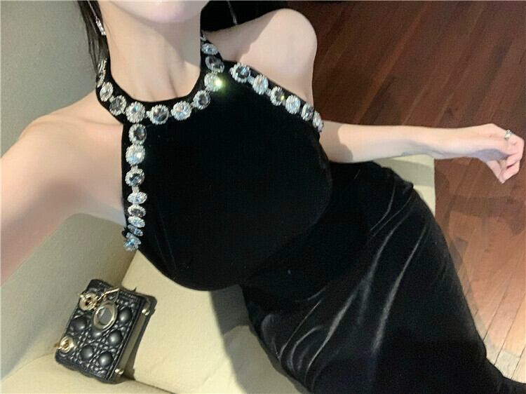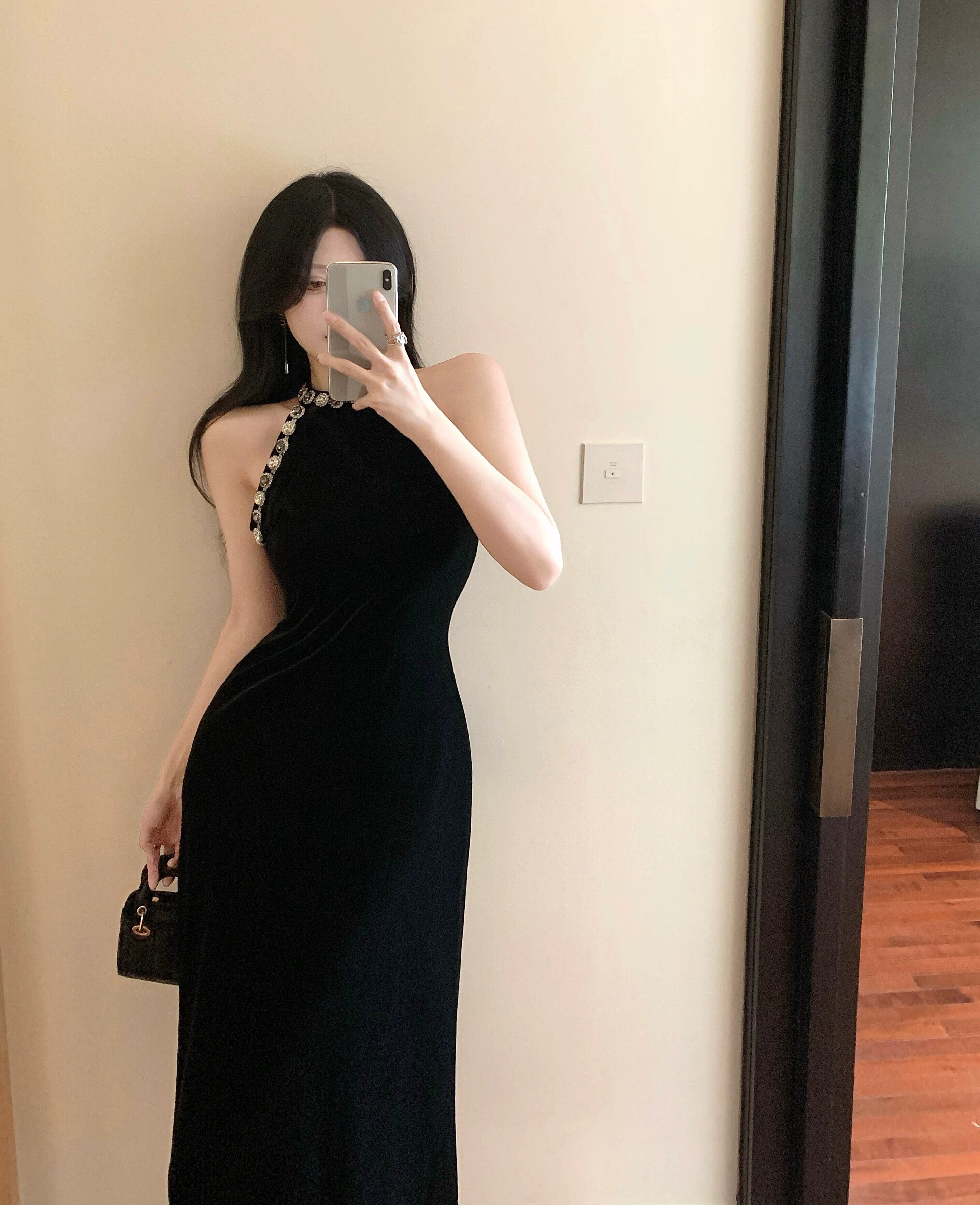社交界のベルベットのホルタードレス女性の春の頑丈なダイヤモンドがちりばめられた黒のスカートハイエンドのイブニングドレスロングスカート ブラック スプリング 春物 berry68730623384 | beaute25